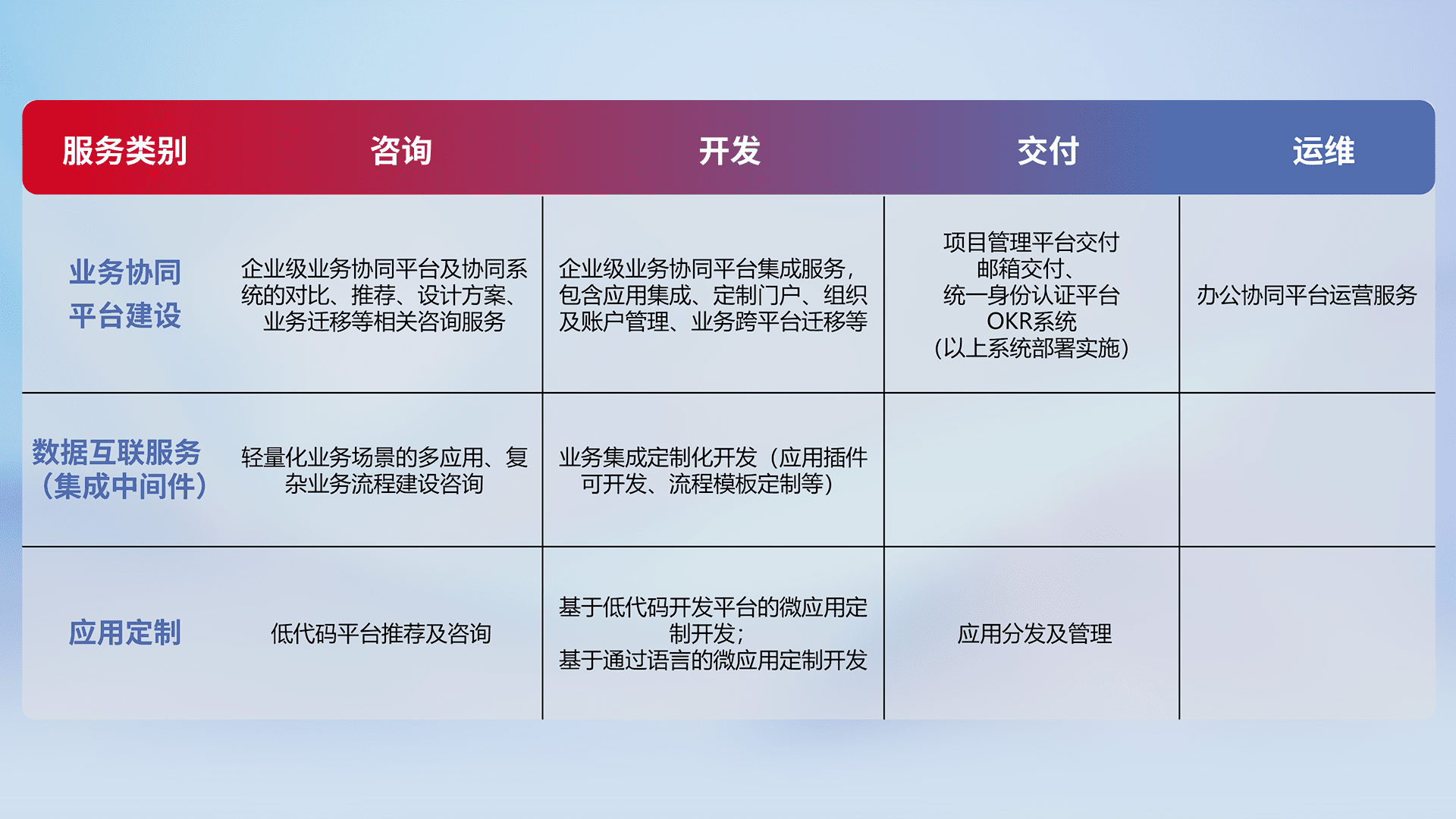 针对钉钉、、企微、、、、IDaas等平台级产品提供产品的规划、、、、方案、、、交付、、定制化开发等服务,,,实现如统一协同办公、、、智能客户服务、、混合会议管理、、智能数据查询、、、等业务场景,,,,实现数字化转型。。