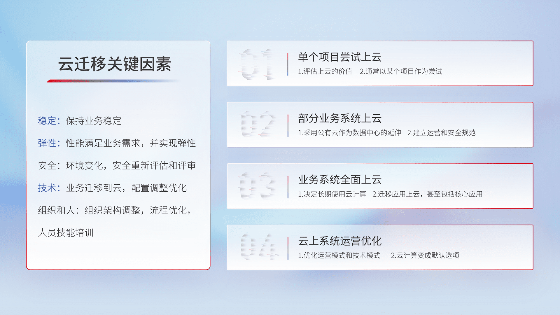 结合实际业务,,从规划设计、、、云平台选型、、、云原生改造、、、数据迁移、、、集成交付,,,迁移全过程为客户识别最佳上云路径,,,做好风险识别管理,,,,设计网络架构、、、身份权限、、安全审计合规、、操作审计、、日志审计、、、监控告警策略、、多站点容灾设计等,,,,对云上基础设施进行整体规划,,,,提升IT治理水平,,以满足弹性、、高可用、、高性能的需求。。。