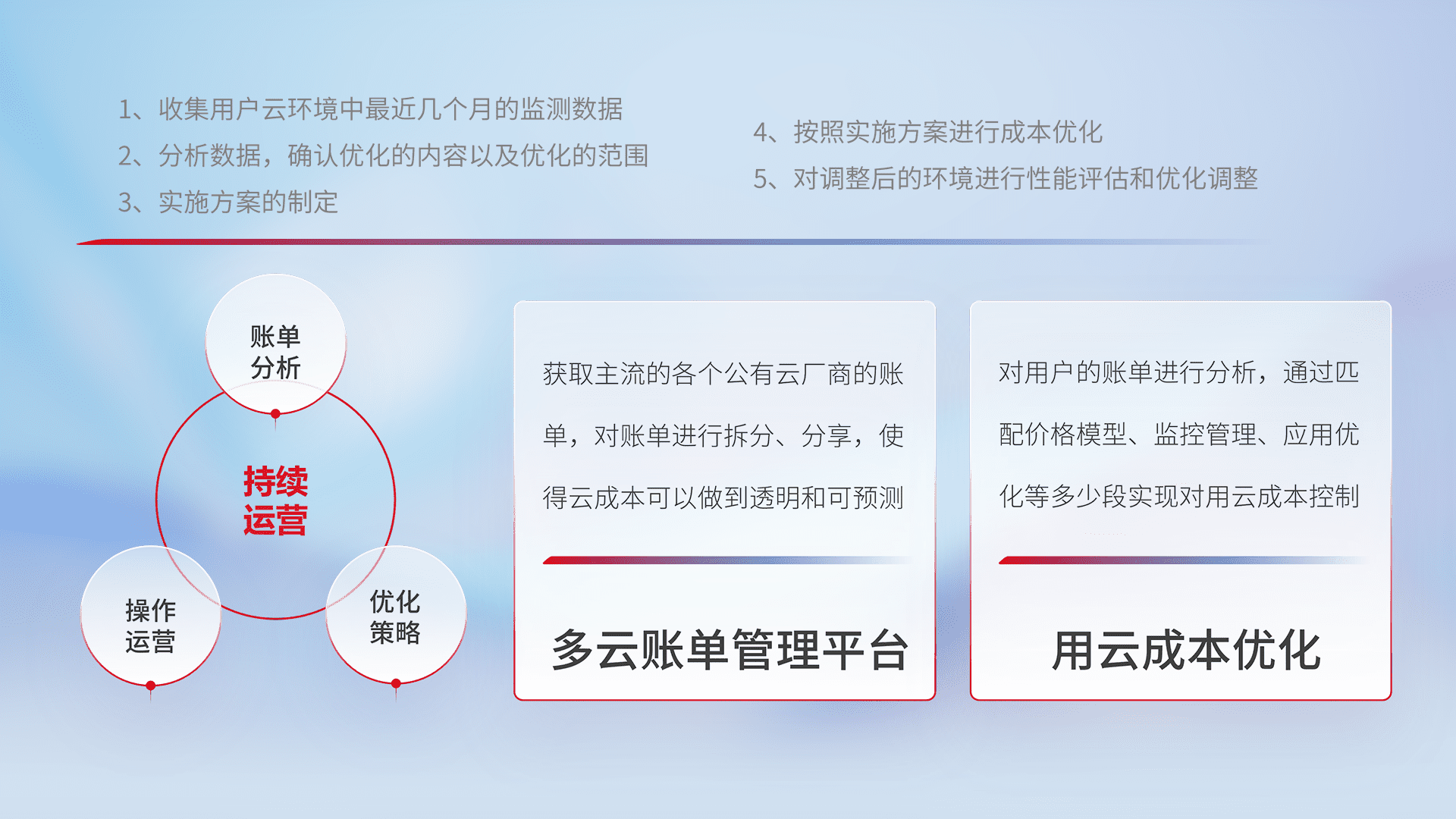 通过多云纳管,,,,以统一的资源数据模型把客户的云资源进行抽象和封装,,,,进而实现对多云资源的统一操作,,,,保障云资源管理的可靠性、、、稳定性与可用性。。。。量身定制化运维内容,,,,配置、、、、开发运维、、、补丁管理、、备份、、监控、、认证和访问管理、、、、审计和日常巡检等,,,保障在用云过程中的可靠度,,,,稳定度以及高可用率。。